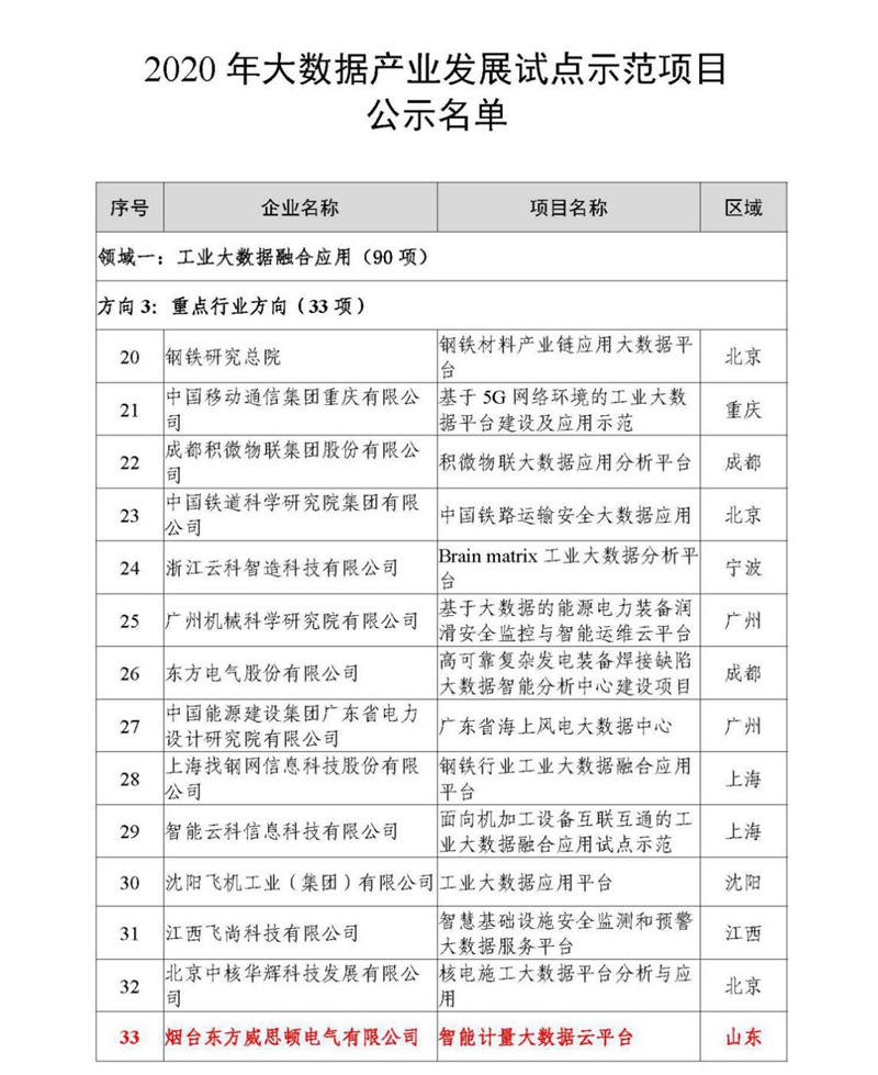 近日,工业和信息化部办公厅公布了2020年度大数据产业发展试点示范项目名单,东方威思顿公司自主研发的“智能计量大数据云平台”名列其中。