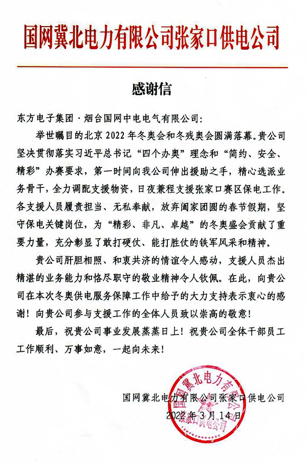 截至目前共有股份公司收到来自国网北京市电力公司、国网天津市电力分公司、国网冀北电力有限公司张家口供电公司、国网冀北廊坊供电公司的感谢信;威思顿公司收到来自国网冀北电力有限公司张家口供电公司的感谢信;国网中电公司收到来自国网冀北电力有限公司张家口供电公司的感谢信;玉麟公司收到来自中铁二局集团有限公司的感谢信。