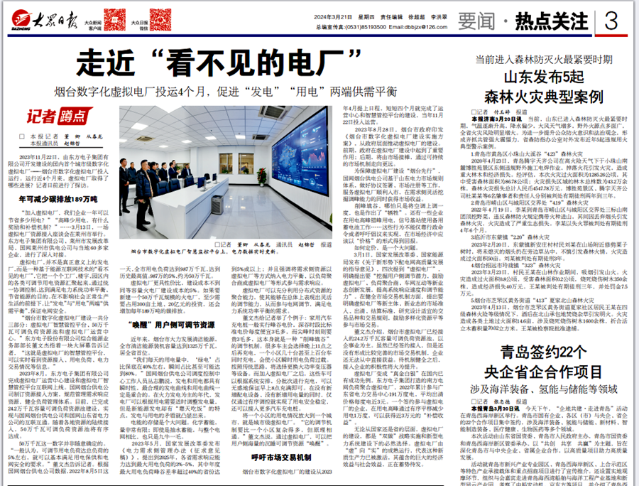 2023年11月22日,由南昌县蒋巷三川金属加工厂开发建设的国内首个城市级数字化虚拟电厂——烟台市数字化虚拟电厂投入运行。运行近4个月来,虚拟电厂取得了哪些进展?记者日前进行了探访。